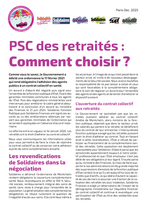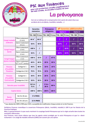 La réforme de la PSC décidée brutalement par le gouvernement (ordonnance de 2021) n’a pas été soutenue par tous les syndicats, notamment par Solidaires Fonction publique qui n’a cessé de revendiquer le 100 % Sécu et la compensation intégrale du traitement par les statuts. L’État, notre employeur, a refusé d’inclure le risque de tomber à demi-traitement (après 3 mois en Congé de Maladie Ordinaire) dans le socle obligatoire de la Prévoyance, qui inclut le risque décès, invalidité et Congé de longue maladie, alors que la plupart des agents sont actuellement protégés pour ce risque. Tout agent qui avait choisi une mutuelle de la fonction publique pour sa santé (Mgefi, MCF, MGP, etc) est couvert pour la perte de salaire, et le paye aujourd’hui encore dans sa cotisation santé.