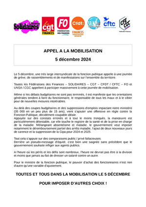 Le 5 décembre, une très large intersyndicale de la Fonction publique appelle à une journée de grève, de rassemblements et de manifestations sur l’ensemble du territoire. Toutes les Fédérations des Finances – SOLIDAIRES – CGT – CFDT / CFTC – FO et UNSA / CGC appellent à participer massivement à cette journée de mobilisation.