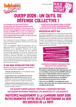 La campagne du Document Unique d’Évaluation des Risques Professionnels (DUERP) 2026 va débuter. Des réunions de services sont obligatoires pour présenter et établir le DUERP. A leur issue, les cadres de proximité saisissent les risques recensés dans l’application Prév’action, en lien avec les assistants de prévention. Pour Solidaires Finances Publiques, le DUERP n’est pas une simple formalité et encore moins un simple papier administratif.