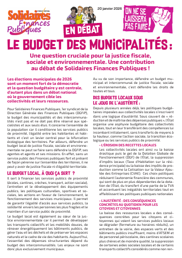 Pour Solidaires Finances Publiques, 1er syndicat de la Direction Générale des Finances Publiques (DGFiP), le budget des municipalités et des intercommunalités n’est pas et ne doit pas être réservé aux spécialistes et aux seuls élus. Il concerne l’ensemble de la population car il conditionne les services publics de proximité, l’égalité entre les habitantes et habitants et c’est un levier central pour la bifurcation écologique des territoires. Par ailleurs, défendre un budget local de justice fiscale, sociale et environnementale ne peut se faire sans défendre la DGFiP, ses agentes et agents et ses missions. En effet, sans un service public des Finances publiques fort et présent de façon pérenne sur l’ensemble des territoires, il ne peut y avoir de justice fiscale ni d’égalité territoriale.